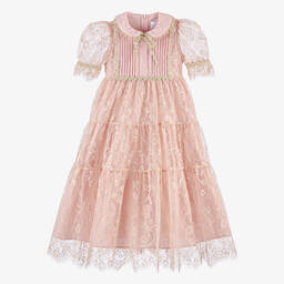 A timeless lilac purple lace dress for girls by EIRENE, exclusive to Childrensalon. Crafted from lightweight lace with gold metallic detailing, it features a smooth cotton lining for added comfort and modesty. Sweetly embellished with gold ric rac trim on the Peter Pan collar, pleated chest panel, and sheer puffed short sleeves. Ideal for special occasions, it fastens discreetly with a concealed zip on the back. Limited quantities available.