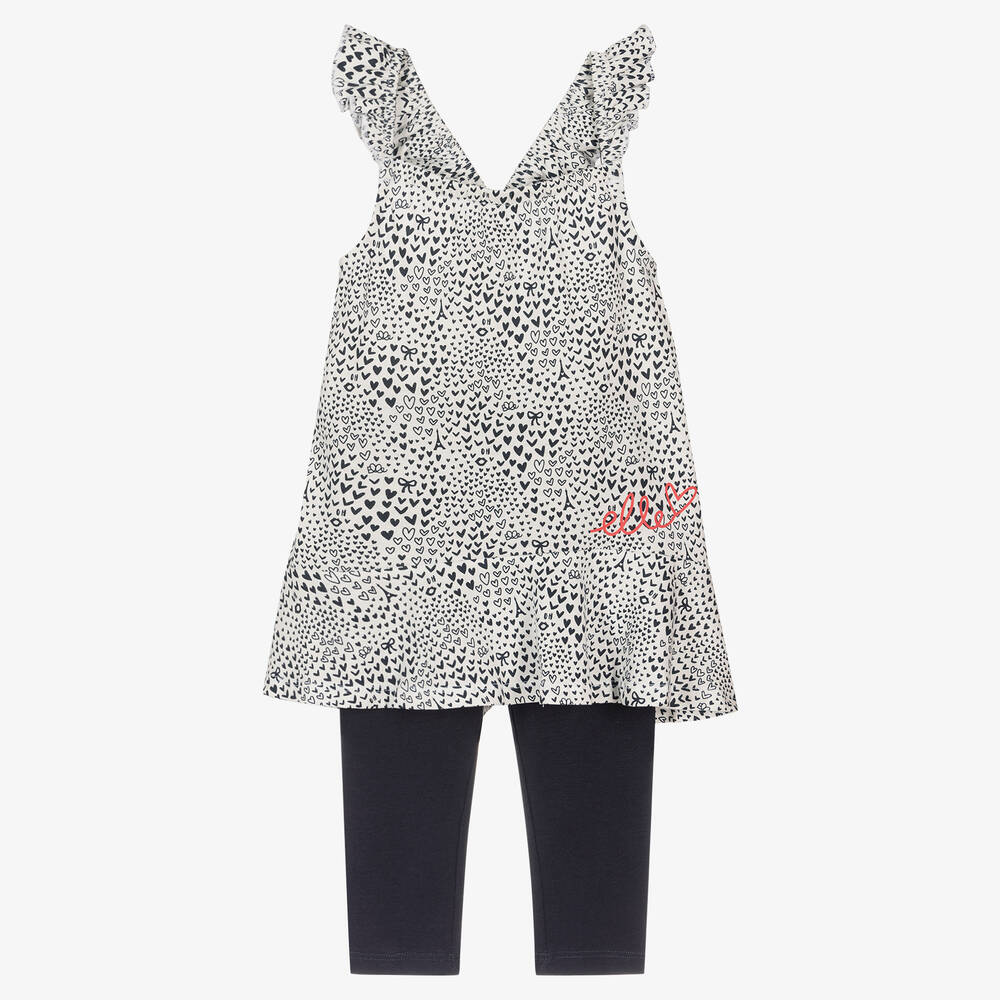In white and navy blue, this fun dress and leggings set for little girls is by Elle. Easy and comfortable to wear, both pieces are made in soft and stretchy cotton jersey. The dress has an all-over heart print, a red logo print on the front, and pretty ruffle straps that are elasticated for comfort. The matching leggings complete the outfit.