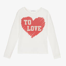 Ivory cotton jersey long sleeve top for girls, by Italian brand Elsy. It has a fun love heart print with a blue glitter slogan on the front.