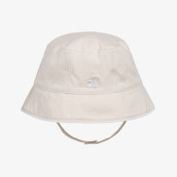 A pink bucket hat for baby girls by Emile et Rose, made and lined in soft and stretchy cotton jersey. This pretty floral patterned sun hat has frilly trims with a cute logo embroidered on the front. There is a velcro fastening strap to secure under the chin.