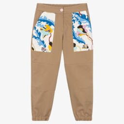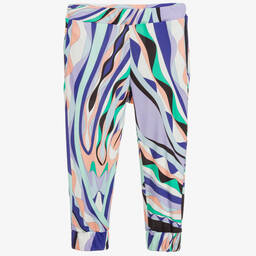 Girls soft velour, silk-blend trousers by Emilio Pucci. The luxury Italian brand, renowned for its vibrant geometric prints, has designed a beautiful pair of loose-fitting trousers with a blue and green Lilly print and purple abstract petal pattern. They have front pockets, and elasticated ankle cuffs and are fully lined.