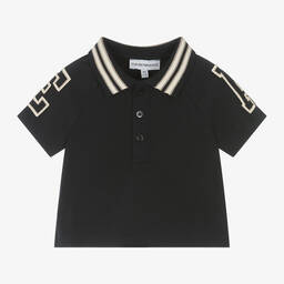 Baby boys green cotton polo shirt by Emporio Armani, crafted from soft and stretchy jersey. Featuring a ribbed collar with ivory and green stripes, and EA initials embroidered on the raglan short sleeves. Neatly fastened with embossed buttons for a stylish look. Limited quantities available, last chance to buy.
