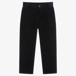 Smart-casual navy blue chinos for baby boys, by Emporio Armani. Made in soft lightweight cotton twill, they have the brand's iconic Eagle logo appliqué on the back in charcoal grey, and comfortable adjustable waist to alter as your baby grows.