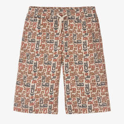 Cool beige Mini-me shorts for boys from luxury designer Emporio Armani. These soft cotton twill bottoms have a vibrant, abstract print in tones of orange and red, incorporating the Italian label's signature Eagle logo. For a comfortable fit, the elasticated waist is adjustable with a branded drawstring. These shorts contain organic and recycled fibres.