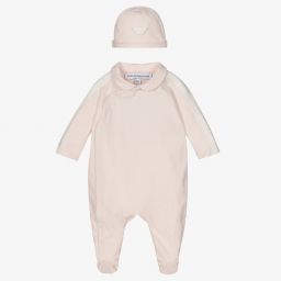 Pale blue babygrow and hat gift set for boys by Emporio Armani, made in soft, comfortable cotton jersey. The babygrow has white logo tape on the sleeves with a raised Eagle logo design. It has a rounded collar and concealed popper fastenings on the front and one leg. The hat has a velvet and rubberised Eagle logo appliqué.
