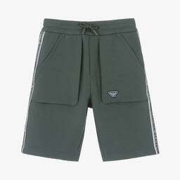 Boys navy blue jersey shorts by Emporio Armani feature sporty white logo taping on the sides. These Bermuda-length shorts are crafted from super soft, stretchy cotton jersey with an elasticated waistband and faux drawstring. Front patch pockets, including one with the signature Eagle logo badge, add practical style. Last chance to buy this comfortable and stylish piece, perfect for everyday wear.