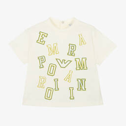 The boys navy blue letter print T-shirt by Emporio Armani is crafted with delicate skin in mind. Made from soft cotton jersey, it features branded poppers on the back for easy dressing. The front showcases grey logo letters and the iconic Eagle motif, making it unmistakably designer. Limited quantities available, so this is your last chance to buy.