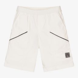 Navy blue shorts for boys by Emporio Armani, made in a lightweight cotton poplin. They have an elasticated waist and four front pockets, two of which are trimmed in white. There is a grey rubberised Eagle logo badge on the front.