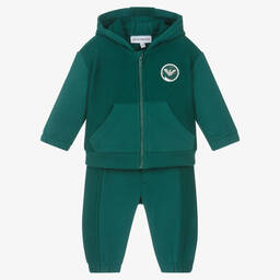 Bright blue tracksuit for younger boys by Emporio Armani, with the Italian brand's rubberised Eagle logo patch on the chest. It is made in soft cotton jersey with reversed panels for a textured contrast. The hooded zip-up top has a front pouch pocket and the cuffed joggers have a gently elasticated ribbed waistband for comfortable wear.