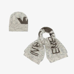The boys blue iconic knit set by Emporio Armani features a stylish hat and scarf, crafted from a luxurious cotton and wool blend for ultimate warmth. The scarf displays a bold Navy Blue intarsia logo, while the hat includes a cosy ribbed brim. Suitable for keeping warm during winter outings, this set offers both comfort and a signature designer look. Limited quantities available, so don't miss your last chance to buy this exclusive set.