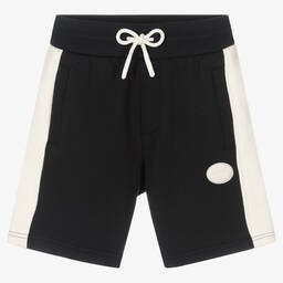 Casual green shorts for boys by Emporio Armani, made in relaxed cotton sweatshirt jersey. Featuring sporty ivory stripes down the sides, they have an ivory Eagle logo appliqué on one leg and a drawstring waist for all-day comfort.