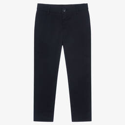 Grey chino trousers for boys by Emporio Armani, made in soft mid-weight cotton, with pockets on the front and back. There is a metal Emporio Armani logo on the back. They fasten with a button and zip and have a useful adjustable waist.