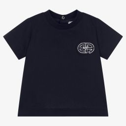 Ivory T-shirt for little boys by Emporio Armani, made in soft cotton jersey. It has a navy blue and white EA logo patch on the chest, with popper fastenings on the back.