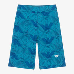 Boys ivory eagle cotton shorts by Emporio Armani feature a striking design from the EA Crew capsule collection. These shorts boast an ivory and lime green graphic pattern with the iconic Eagle logos in navy blue outlines and lime green accents. Crafted from super soft cotton sweatshirt jersey, they ensure comfort with an elasticated waist and ribbed trims. Perfect for warm weather, they include neatly concealed side seam pockets and a rubberised logo by the hem. Limited quantities available—last chance to buy.