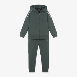 Boys navy blue cotton tracksuit by Emporio Armani offers a luxurious and comfortable fit. Crafted from a soft cotton-blend jersey, the tracksuit features iconic Eagle patches and logo tape trims for a signature look. The hooded top has a front zip fastening with a branded zip puller, while the joggers have concealed side seam pockets, cuffed ankles, and an elasticated waist with a faux drawstring detail. Limited quantities available, so don't miss your last chance to buy this stylish tracksuit.