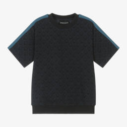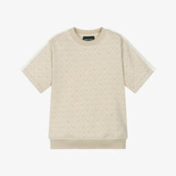 The beige eagle-patterned T-shirt for boys by Emporio Armani is crafted from luxurious cotton piqué, offering a blend of comfort and style. Featuring the iconic eagle jacquard logo, this piece stands out with its sporty ivory shoulder trims and ribbed hem. Perfect for the spring and summer months, it adds a touch of sophistication to any outfit. Available in limited quantities, this is a last chance to buy a unique addition to a young wardrobe.