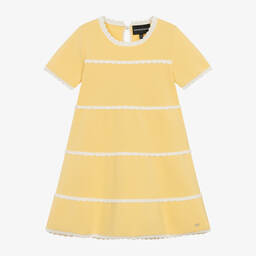 This girls yellow cotton knit dress by Emporio Armani offers a soft and elegant choice for spring and summer. Made from gentle knit fabric, it features white scalloped trims and a keyhole button fastening at the back. The pearlescent Eagle logo charm at the hem adds a subtle designer touch. Perfect for everyday wear or special occasions, this is a last chance to buy item with limited quantities available.