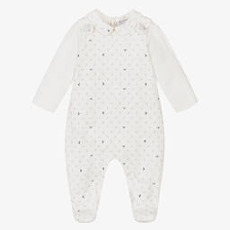 Navy blue cotton babygrow set for boys and girls by Italian designer Emporio Armani, made in comfortable jersey. The ivory bodysuit has a navy blue Peter Pan collar patterned with the brand's signature Eagle logo in contrasting blue and grey. It fastens with easy-to-use logo poppers on the back and between the legs. Patterned with logos, the coordinating dungaree-style babygrow fastens with buttons on the shoulders and with poppers between the legs.