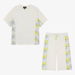 Teen boys blue cotton shorts set by Emporio Armani offers a super cool, sporty, and relaxed vibe. This set features a comfortable, lightweight jersey fabric with side panels patterned with the signature Eagle logo in contrasting blue. The top has a casual, loose fit and a central, rubberised Eagle logo badge. The Bermuda shorts have a stretchy waistband with a faux blue drawstring, making it perfect for everyday wear. Limited quantities available.