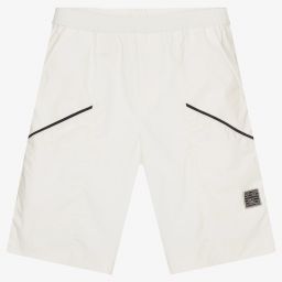 Teen boys smart-casual dark navy blue shorts for teen boys by Emporio Armani, with an elasticated waist for a comfortable fit. The front pockets are trimmed with white stripes, and there is a rubberised grey Eagle logo badge near the hem. These cool shorts are made in super lightweight and soft cotton poplin.