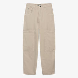 Teen boys green cargo trousers by Emporio Armani offer a relaxed-fit in soft, mid-weight cotton twill. With a cool cargo look, these trousers feature five-pocket jeans styling and additional oversized pockets on each leg. The brand's iconic Eagle logo in antiqued silver tone is on the back and coin pocket. Fastened with a button and zip, these trousers are perfect for casual wear. Limited quantities available.