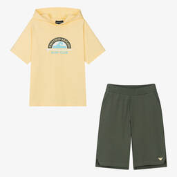 Teen boys teal green shorts set by Emporio Armani features an eye-catching surf-themed logo print in orange, white, and navy blue on the soft jersey hoodie top. The coordinating navy blue shorts are crafted from mid-weight piqué jersey, offering practical front pockets and a comfortable elasticated waistband. With stepped, shaped hems and an orange Eagle logo, this stylish set is perfect for everyday wear. Limited quantities available, so don't miss your chance to buy.