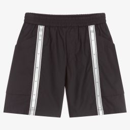 Boys white cotton poplin shorts by Emporio Armani, with silver Eagle logo tape trims. Beautifully soft and lightweight, these casual shorts have large side pockets and a comfortable elasticated waistband.