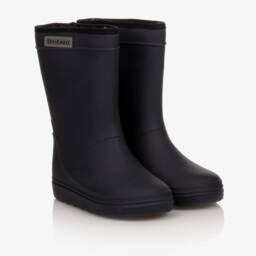 Dark blue thermal rain boots for boys and girls by Danish brand EN FANT, in super flexible eco-friendly rubber. They have a seamless waterproof exterior to keep their feet dry and a reflective logo on the side for high visibility. Warm down to -30*C, they are lined in plush wool with an aluminium membrane for added insulation. They have a good grip on wet and icy surfaces thanks to the non-slip sole.