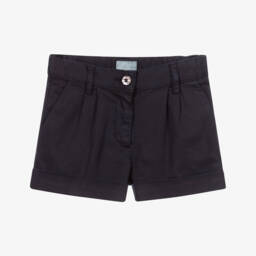 Girls smart navy blue shorts by Il Gufo. Made in smooth woven cotton with front pleats, turned up leg cuffs and two side pockets. They fasten with a zip and button and have an elasticated, adjustable waistband.