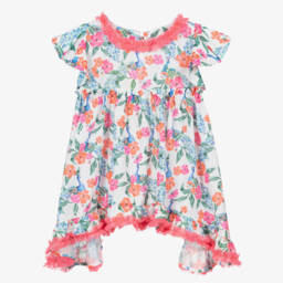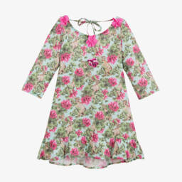 A sweet turquoise blue beach dress for girls from Selini Action, with beige floral print and leopard print ruffled trim. Made in lightweight cotton poplin, the elasticated off-the-shoulder ruffles are decorated with pretty blue sequins.