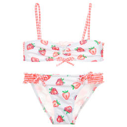 Sunuva girls blue two-piece bikini, with a bohemian 'Ikat' tie-dye style print. The slip-over top has stretchy straps over the shoulders and a ruched, elasticated back with ruffled edges.The matching bottoms have ruched, elasticated sides decorated with ruffles and bows. Made from smooth, stretchy fabric, it has UV sun protection of 50+ to protect delicate skin against the sun's harmful UV rays.