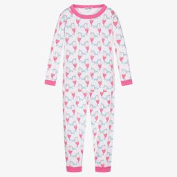 Petrol blue short pyjamas for boys and girls by Fabric Flavours, made in soft cotton jersey. The white top has blue raglan sleeves and a bold red and ivory Superman™ print on the front. The petrol blue shorts have navy blue trims and a striped back.