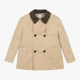 Boys cosy fleece jacket by Fendi is a luxurious choice for little ones. Crafted from a soft blend of wool and cotton, its beige teddy fleece offers warmth and comfort. The jacket features a stylish brown satin chest pocket with the iconic FF pattern, adding a touch of designer flair. Fastened with a zip and a protective chin guard, it's lined with soft satin for added comfort. Perfect for autumn and winter outings, it's a last chance to buy with limited quantities available.