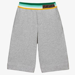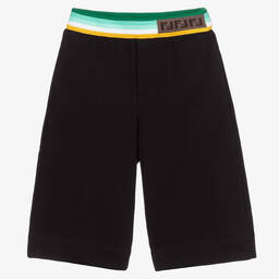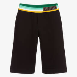 Black shorts for boys by luxury Italian brand Fendi, made in mid-weight cotton sweatshirt jersey. They have side seam pockets and a back pocket, with a green, white and yellow striped and ribbed waistband. There is a brown FF logo pattern on the front of the elasticated waistband.