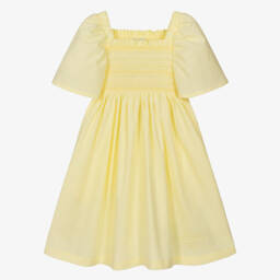 Girls lilac pink dress from luxury Italian brand Fendi, made in lightweight wool twill. It has the iconic FF logo embroidery in shades of pink under the square neckline and beautiful puffed sleeves. The skirt is gathered from the bodice, with side pockets and button fastenings down the back.