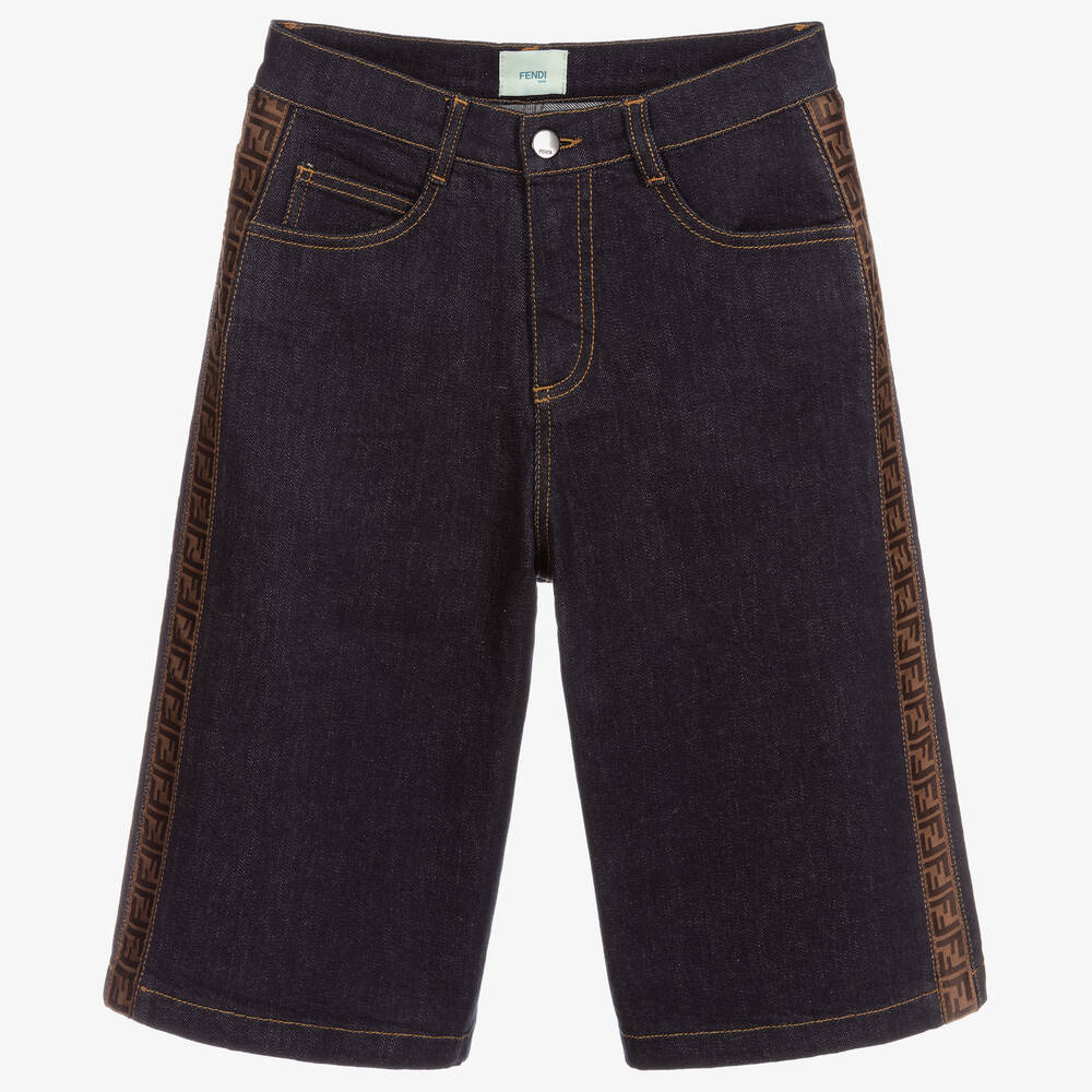 Teen boys blue stretch denim shorts by luxury brand Fendi. With classic five-pocket styling, they have brown FF logo tape on the sides, and fasten with a zip and button. They have a longer Bermuda length and a flattering straight-cut fit.