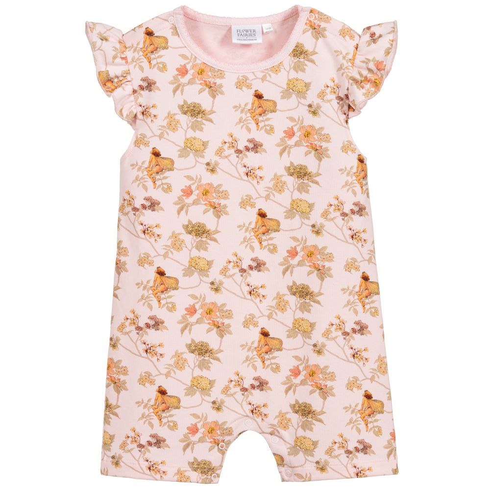 Baby girls pink cotton shortie by Flower Fairies™ by Childrensalon. Made in super soft pink cotton jersey, with a delightful Flower Fairies print from the original illustrations by Cicely Mary Barker.