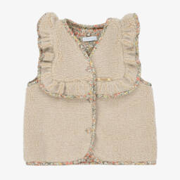 This lovely sherpa vest for girls by Foque is a beautiful blend of style and comfort. Crafted from soft bouclé sherpa, it features delicate floral trims and charming frilled edges for a touch of elegance. The cosy cotton lining provides a snug fit, while fabric-covered buttons add a coordinated finish. Suitable for layering, this vest is ideal for adding warmth and flair to autumn and winter outfits. Limited quantities available, don't miss out.