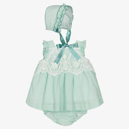 Pretty pale pink-beige dress set for little girls by Spanish brand, Foque. Made in beautifully soft and lightweight cotton cheesecloth, the sleeveless dress has ruffles over the shoulders and delicate ivory lace trim across the front. It is fully lined for comfort and fastens with buttons on the back. Matching elasticated knickers and a little bonnet with ribbon ties complete the look.