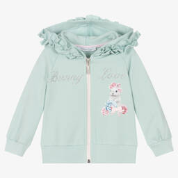 A blue zip-up hoodie for girls by Balloon Chic, made from soft cotton jersey. Cute for layering, this top has a zip fastening, a rose print, and faux satin drawstrings in a houndstooth pattern. There is a red velvet bow on the chest, with a diamanté 'B' logo.