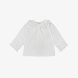Teen girls ivory cotton blouse by Bonpoint, patterned with the brand's iconic cherries in a pink and green colourway. The feminine style has concealed button fastenings on the front with gentle ruffles on the neckline and placket. It is made from soft and lightweight twill and styled with long sleeves and a straight hem.