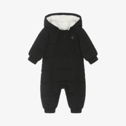 Black hooded puffer snowsuit for baby boys and girls by Calvin Klein. Silky smooth and made from recycled material, it has a soft fleece lining and is softly padded for cosy comfort and warmth. There is a covered zip fastening down the front, with elasticated cuffs to help keep out chilly winds. The brand's monogram logo badge is displayed on the chest for a signature look.