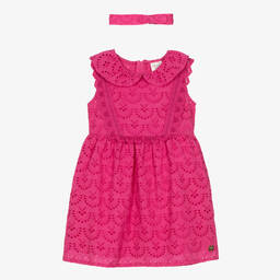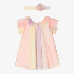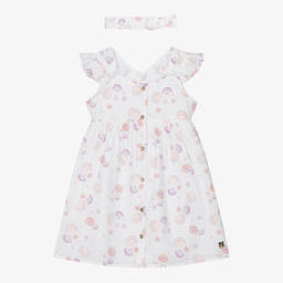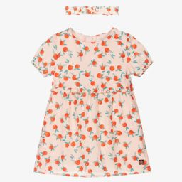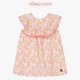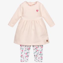 Navy blue dress and leggings set for baby girls by Carrément Beau. The organic cotton velour dress has an all over silver dot pattern, ruffle shoulder trims and a silver logo tab on the front. It fastens with poppers on the back. The leggings are made in soft organic cotton jersey and have an elasticated waist.