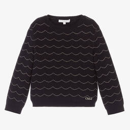Beige jumper for teen girls by French designer, Chloé, as seen in the main collection. Made in a luxurious cotton and wool blend, it has a jacquard design in pink, dark beige and glittering gold yarn with 'C' monogram detailing. The Chloé signature logo is embroidered near the hem in tonal beige.