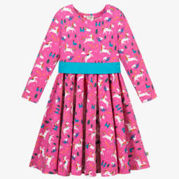 Girls red skater dress from Frugi, made in organic cotton jersey. Soft and stretchy, it has a colourful Christmas pattern and a pretty flared skirt. There is a fixed blue sash around the waist, with a removable bow on the back.