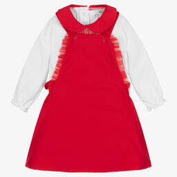 Cute organic cotton top and skirt set for baby girls from FS Baby. The white jersey top has a ruffled poplin collar with yellow trim, and pretty puffed sleeves. Soft and comfortable, it fastens easily with poppers on the back. The poplin skirt has a tropical toucan print in black, yellow, green and pink. The yellow ribbed waistband is stretchy for easy pull-on.