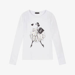 Off-white long-sleeved top for girls by Italian brand Fun & Fun. The front features a stylish lady sitting on a logo-inspired bench, with a small text logo below. This casual tee is made in comfortable jersey, with a crew neck.