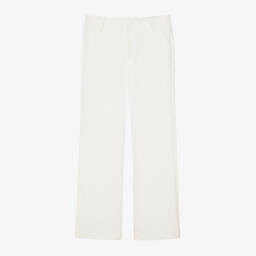 Ivory wide-legged trousers for girls by Fun & Fun offer a blend of elegance and comfort, crafted from soft crêpe fabric with a touch of stretch. Featuring an adjustable waistband with a sparkling diamanté button and a concealed zip, these trousers provide a chic fit. Slanted side pockets and pintuck detailing enhance the sophisticated design. Perfect for a stylish outing, these trousers are available in limited quantities. Hand wash with care to maintain their pristine look.