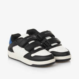 Boys blue and white velcro trainers by Geox feature a stylish red heel panel, adding a vibrant touch. Crafted with smooth faux leather, these trainers are lined with soft textile for added comfort. The removable insole provides anti-bacterial and anti-shock benefits, while the non-slip rubber sole provides stability. With waterproof and breathable Respira technology, these trainers are suitable for active play. Limited quantities available, offering an exclusive choice for the season.