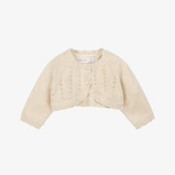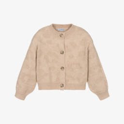 Girls gold cardigan by Mayoral features a charming detachable faux fur collar for a touch of elegance. Crafted with a hint of lurex for a subtle shimmer, this ribbed knit cardigan has ruffled cuffs and hem, with a button-front fastening.